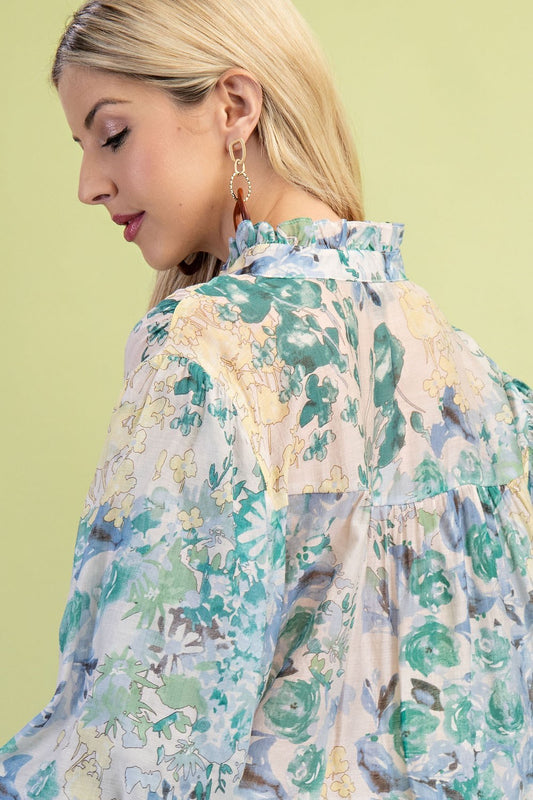 Ivory Mix Floral Button Down 3/4 Balloon Sleeves top