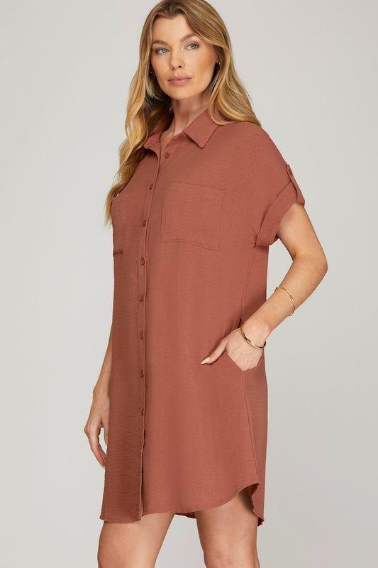 SALE 50% off off DROP SHOULDER BUTTON UP WOVEN SHIRT DRESS WITH POCKETS