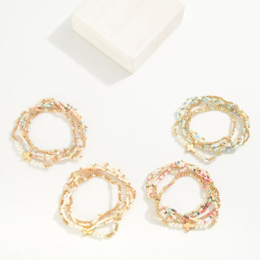 Set of 6 Bead, Pearl and Gold Beaded Stretch Bracelet w Cross Charm