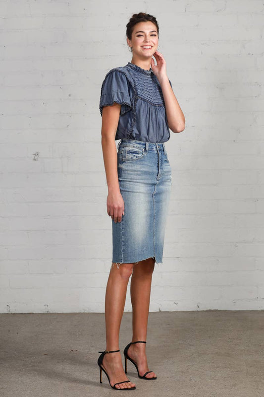 High Rise Stretch Raw Hem Knee Length Denim SkirtRegular price $58.00 USDRegular priceUnit price / per-