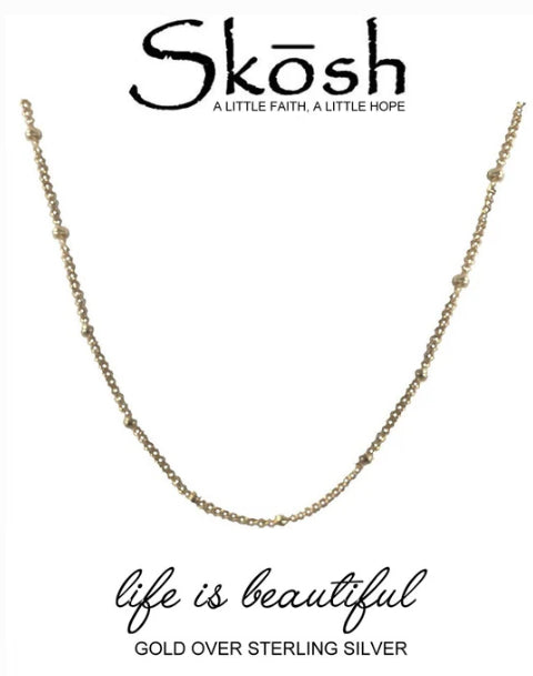 A fine gold chain accented with evenly spaced tiny beads. Simple yet artisanally crafted for subtle texture and quiet interest.