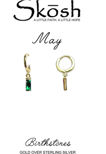 Sleek gold huggie hoops with a vertical rectangular gemstone drop. Clean lines and subtle geometry create a modern, refined silhouette, offering a quiet yet distinct accent to any look. Completed with May’s birthstone, they carry personal meaning while it remaining stylish.