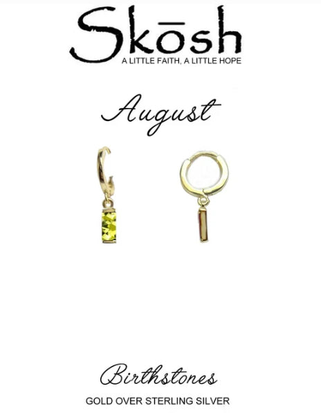 Sleek gold huggie hoops with a vertical rectangular gemstone drop. Clean lines and subtle geometry create a modern, refined silhouette, offering a quiet yet distinct accent to any look. Completed with August’s birthstone, they carry personal meaning while it remaining stylish.