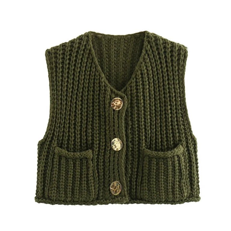 This cozy army green sweater vest buttons down the front and features pockets for added charm. Ideal for fall, it’s a playful match with jeans or skirts to capture those crisp autumn vibes.