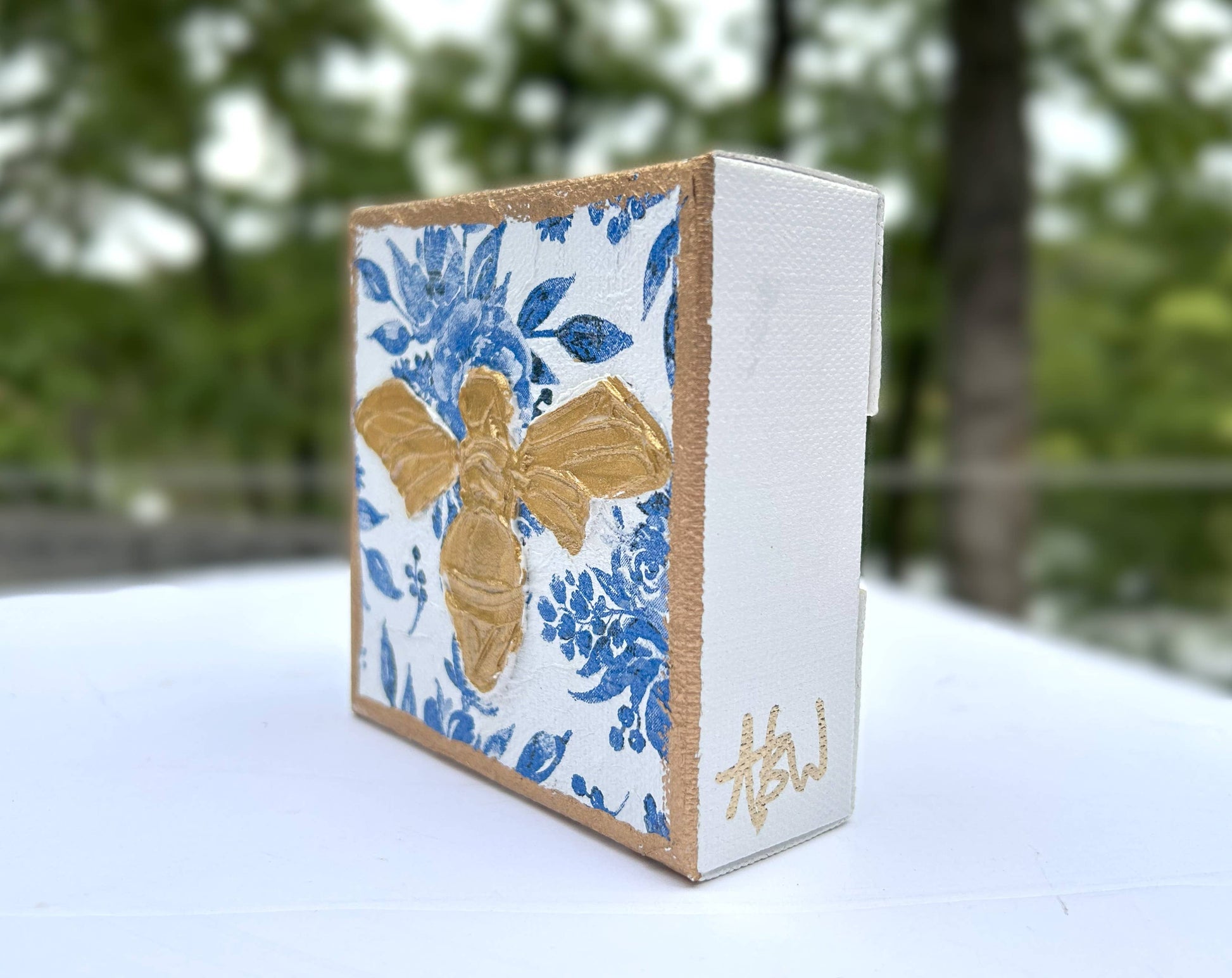 Absolutely beautiful! Give your art wall or your tablescape a touch of formality with these elegant 4x4-inch gallery canvases (1-3/8" thick frame). Perfect for bridal showers, teas, hostess gifts, Mother's Day, graduation, and more. Blue and white patterned background is graced with 4 different textured, white and gold designs: cross, crown, bumblebee, or lemon. Art is handmade, hand painted, and textured. Design is embellished with rich gold accents. Artist initials are on side of canvas and company name is included on the back. Because each design is individually drawn and textured, each block is unique and will vary slightly.