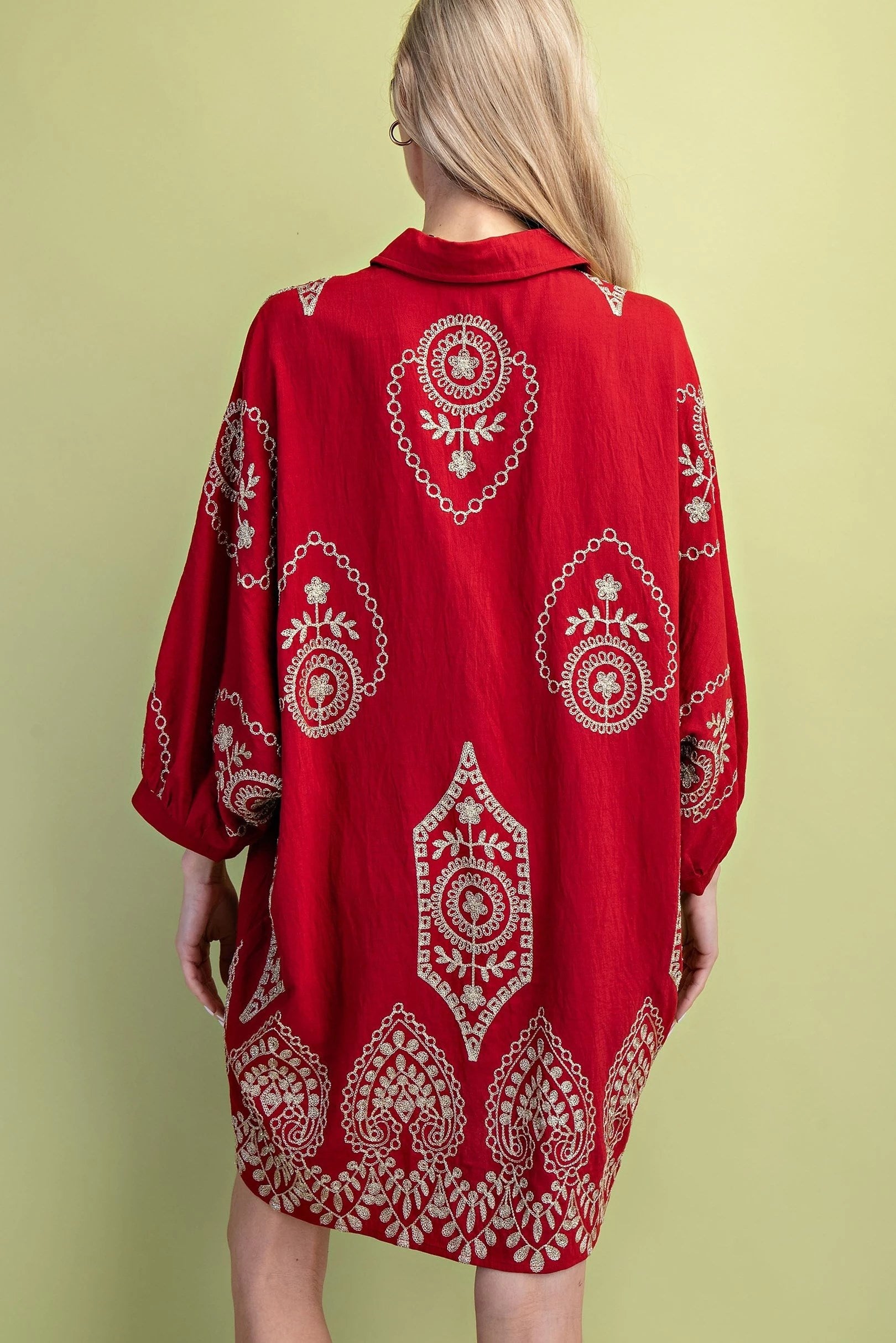 Turn heads in this stylish Crimson Mix Dolman Sleeve Shirt Dress featuring a half-button front and charming metallic embroidery accents. This trendy oversized shirt dress adds the perfect touch of shimmer to your wardrobe. Crafted from a comfy blend of 75% Rayon and 25% Nylon.