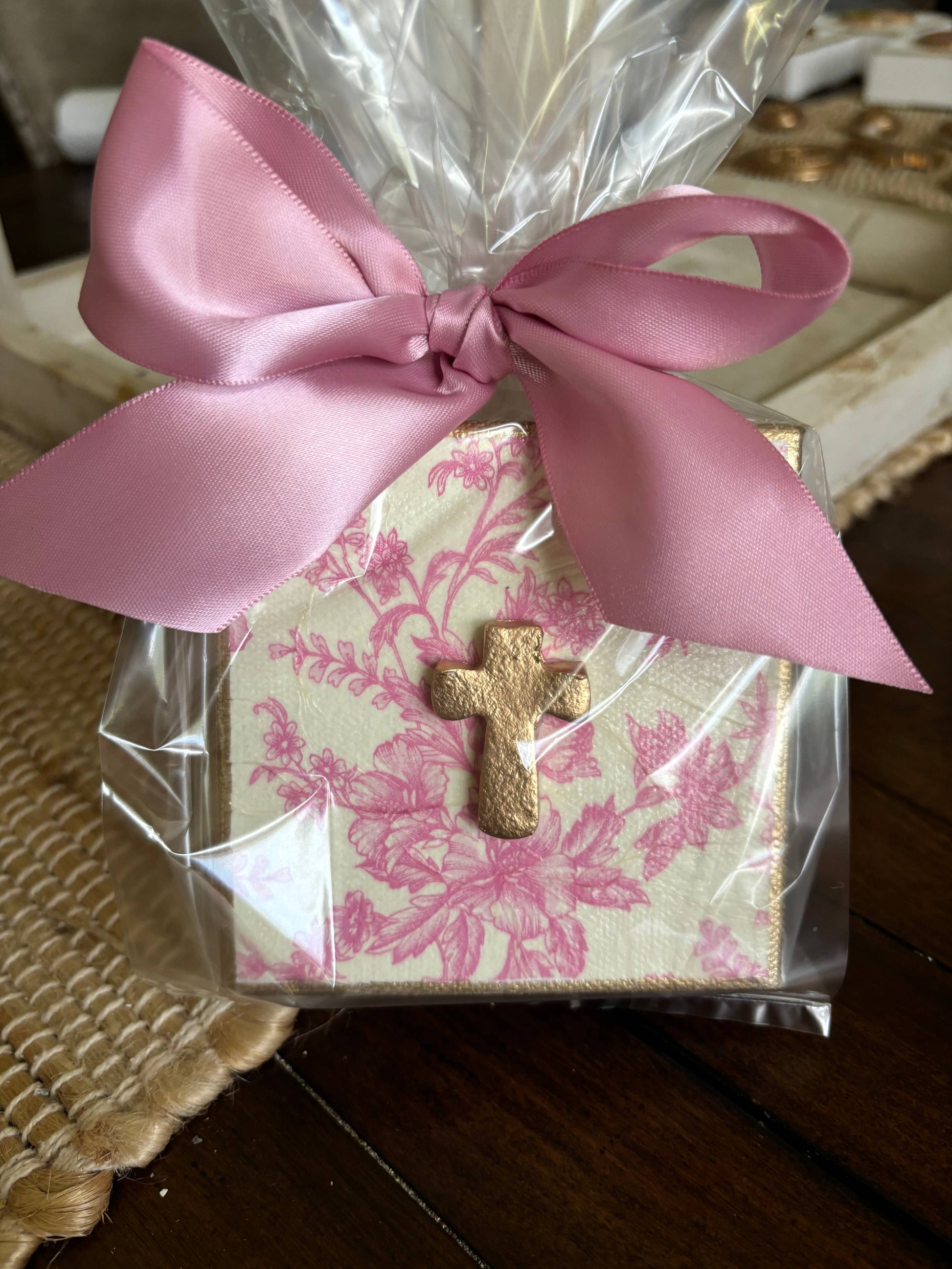 What a beautiful way to add a touch of Southern Charm to your decor!  Beautiful gold gilded cross accents a 4 x 4 vintage floral design canvas.  These make a wonderful hostess gift.