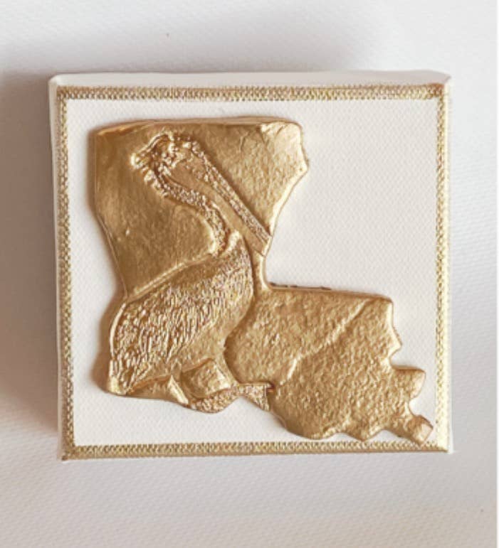 Beautifully detailed Hand Gilded pelican accents a gold edged 4x4 canvas. Perfect home decor accent piece.