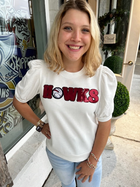 Give Your game Day outfit a posh finish Finish With This Feminine Top. A Round Neckline Leads To Short, Puff Sleeves And A Flattering Fit Bodice. This style runs a little on the smaller size. If you are in between sizes or unsure, size up. Model is wearing a small.