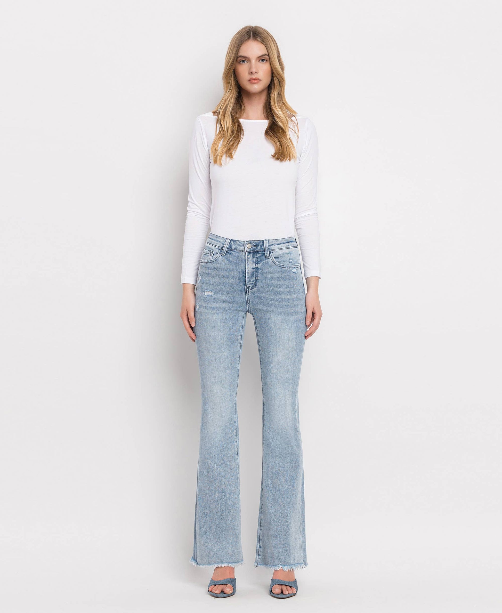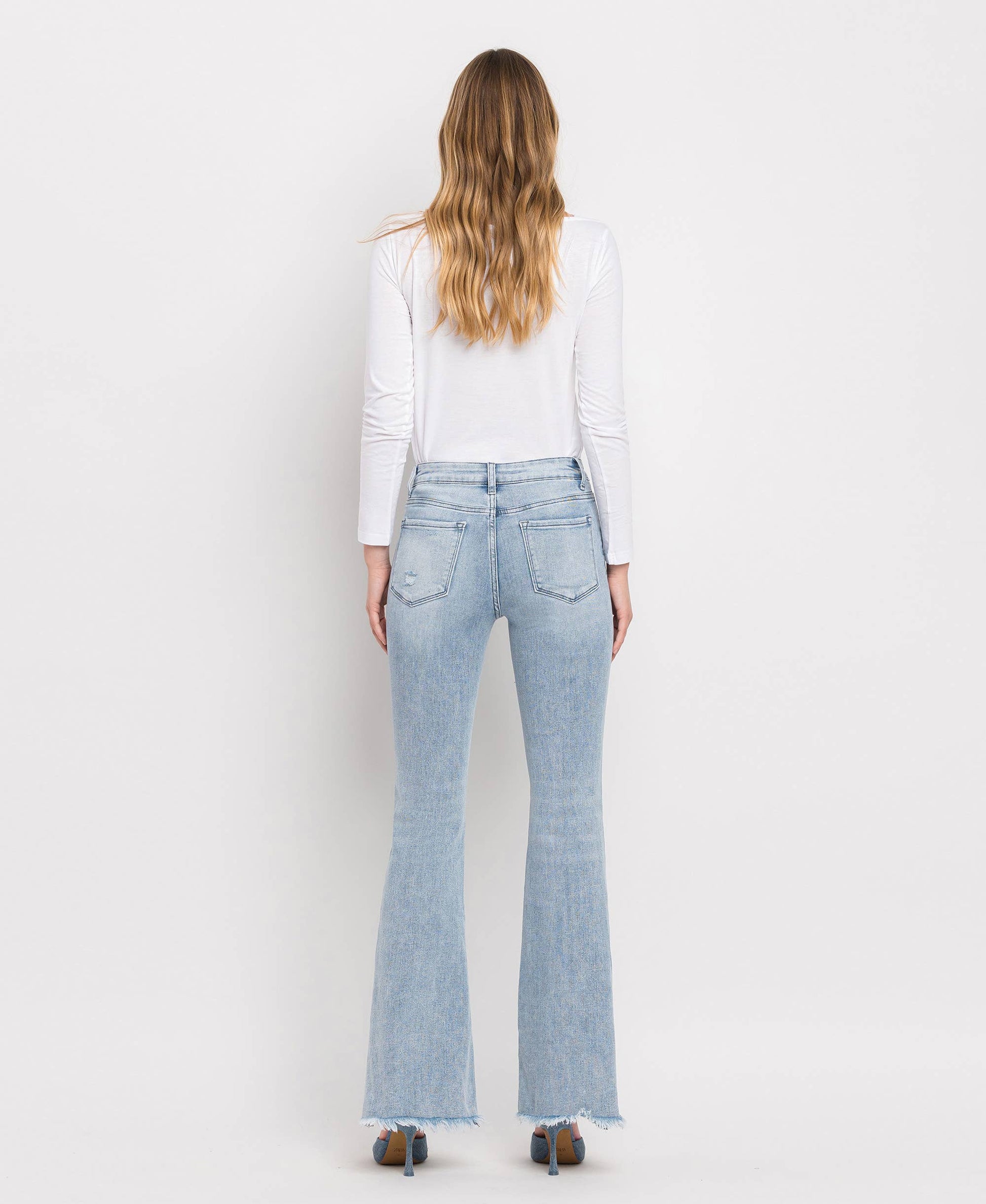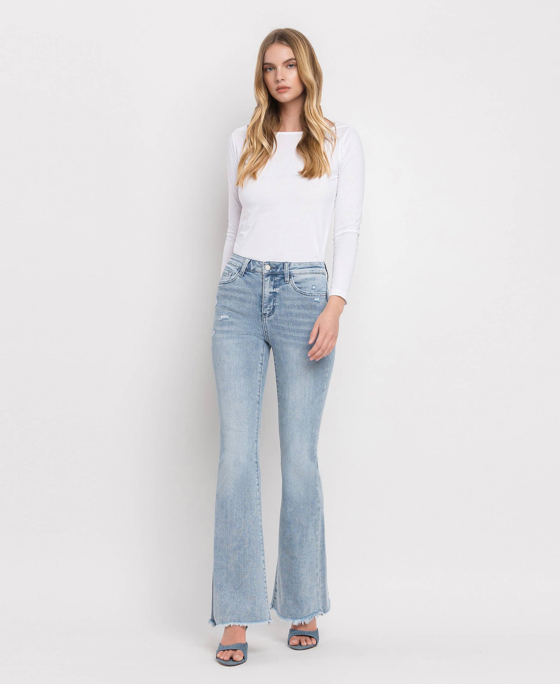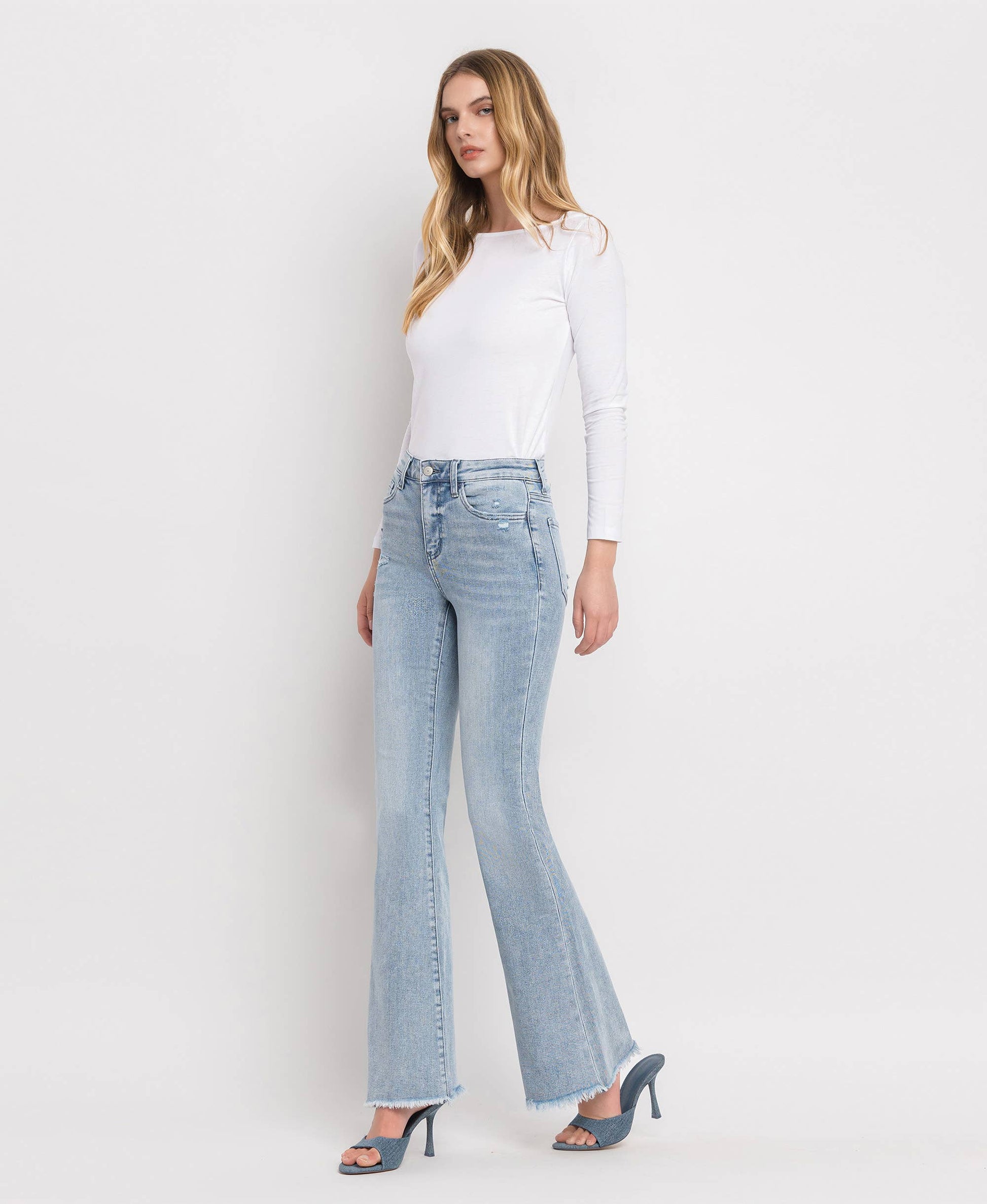 COMFORT STRETCH DENIM, HIGH RISE WAIST, DISTRESSED DETAIL, FRAYED HEM, FULL LENGTH, CLASSIC FLARE JEANS