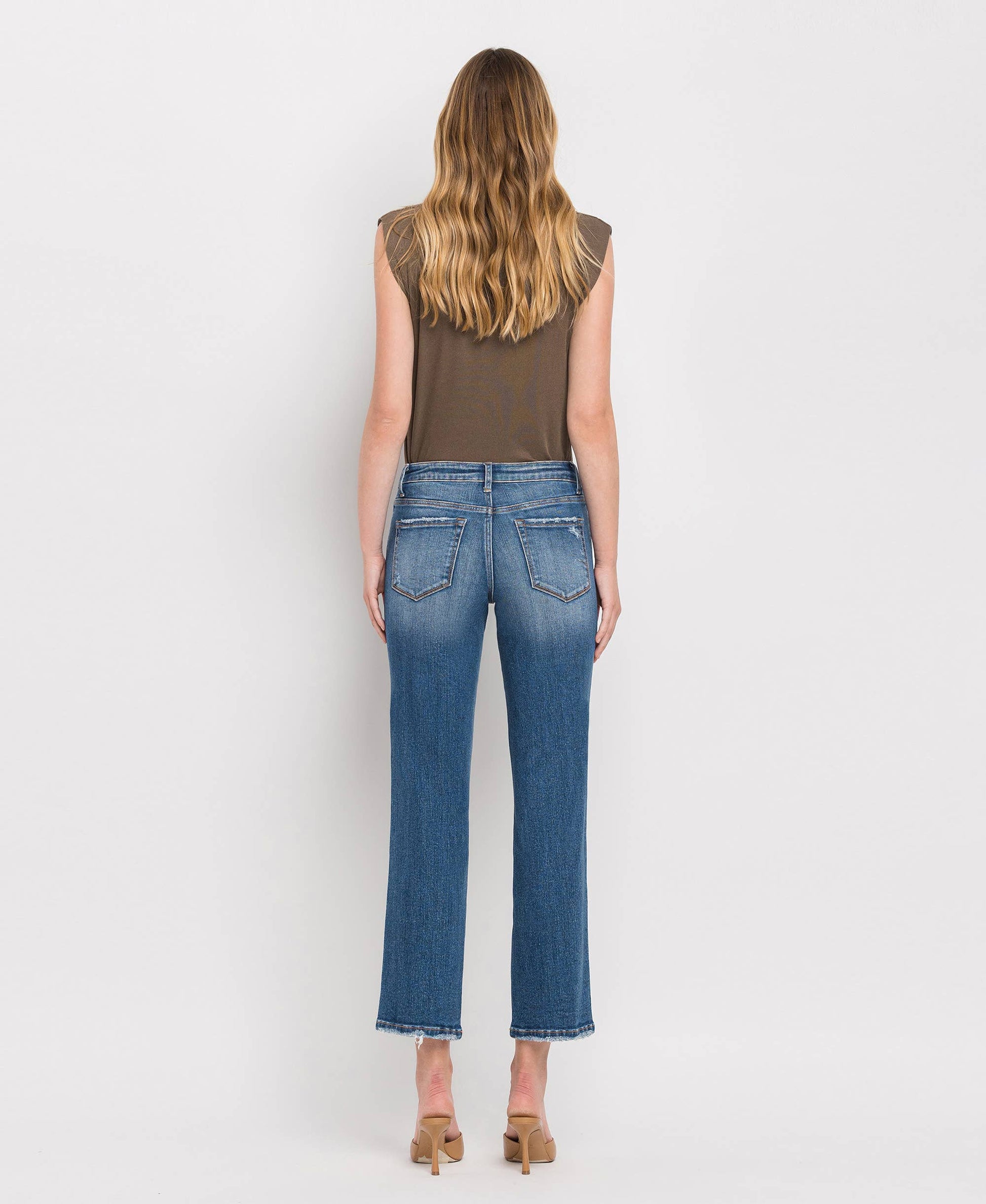COMFORT STRETCH DENIM, HIGH RISE WAIST, SLIGHTLY DISTRESSED DETAIL, FINISHED HEM, CROPPED LENGTH, STRAIGHT JEANS