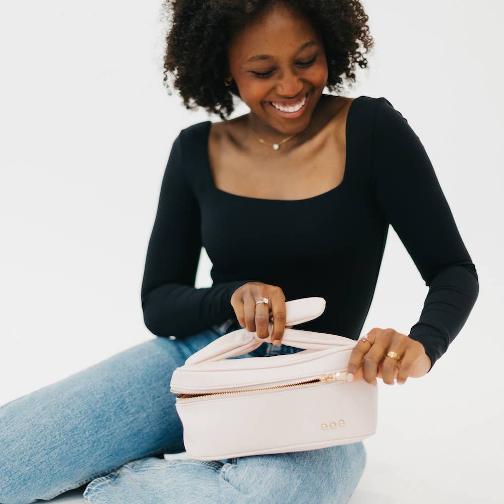 Introducing your new BFF - our Madelyn Bow Makeup Bag! Available in 4 chic colors, this makeup bag has plenty of room for all your beauty products, hair essentials, and more. Plus, there's a zipper pocket with a compact mirror for on-the-go touch-ups. Perfect for stylish travelers and it's easy to clean too! The Madelyn Bow Makeup Bag is another addition to our 3 Sisters Collection! This collection is inspired by the unbreakable bond shared between the owner/founder of Pretty Simple and her 2 sisters. These bags are marked with three signature studs and will complete outfits, catch eyes, and remind wearers of the incredible connection to their own sisters, whether through blood or by choice. You can see it in our inspiration and mission. -Compact mirror inside -Bag measures: 10"L x 7"W x 4.5"H -Spot clean -