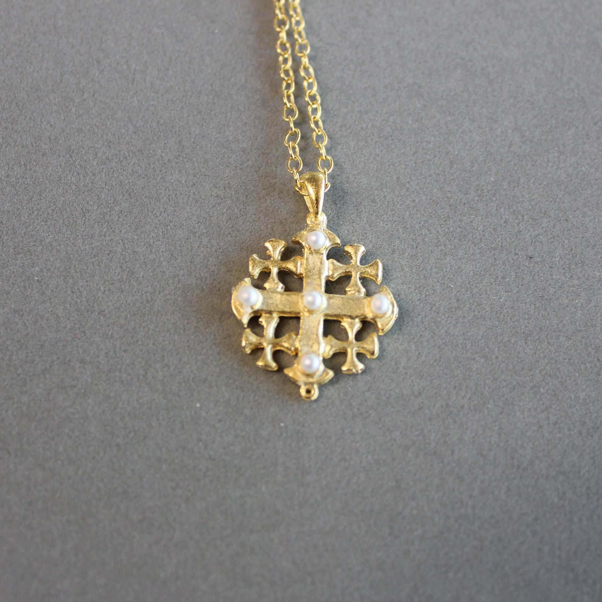 Pearl Jerusalem Cross Necklace. This stunning 18" necklace showcases a Jerusalem Cross adorned with pearl accents. Ideal for occasions such as First Communion or Confirmation, it reflects the brand's commitment to creating timeless, faith-inspired jewelry. The pendant charm necklace is a testament to the beauty of your Christian inner soul, expressing distinctive style while honoring religious and spiritual themes. The use of pearls adds a touch of elegance, making it a cherished piece in any jewelry collection.