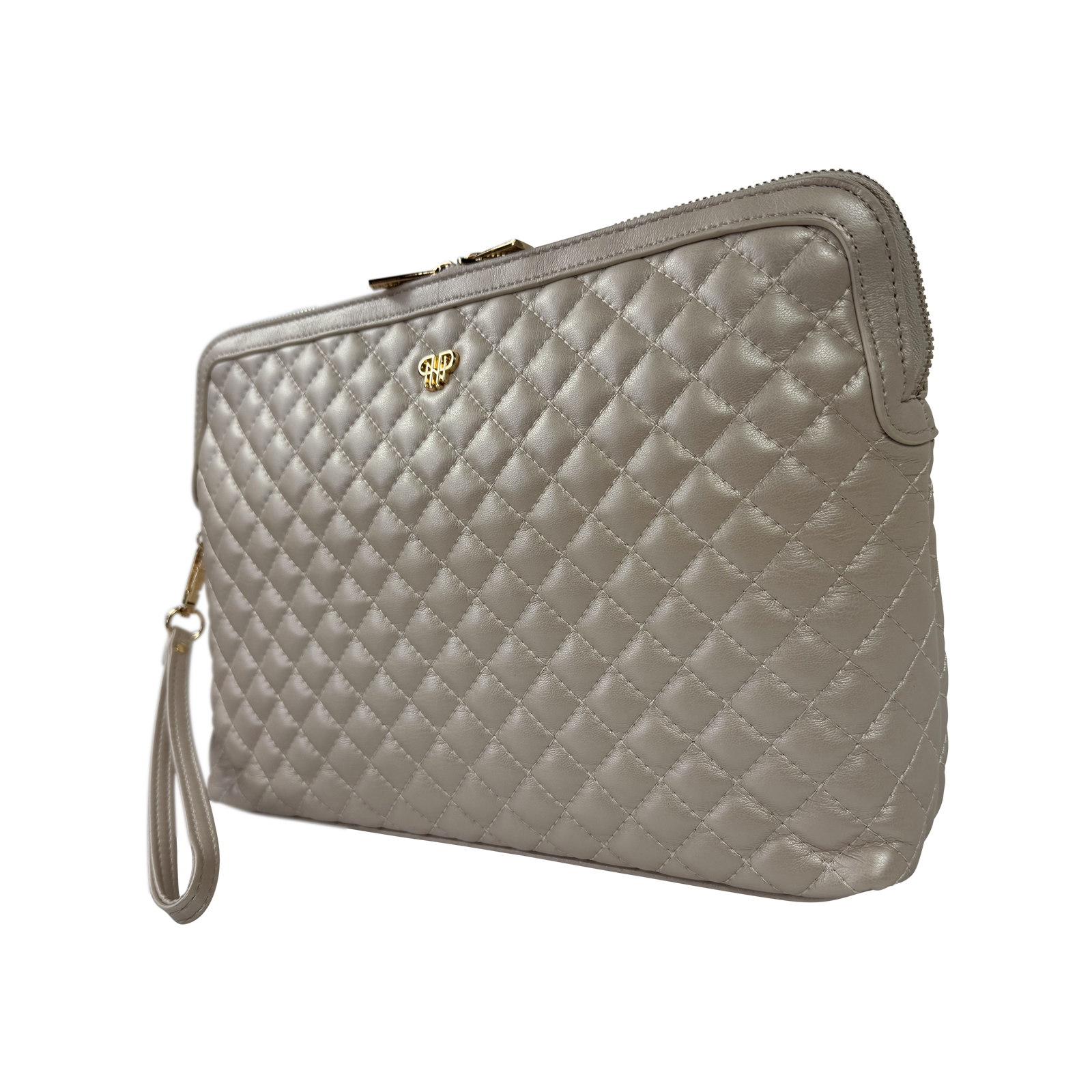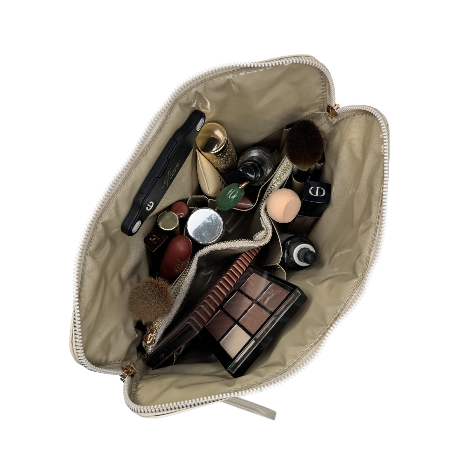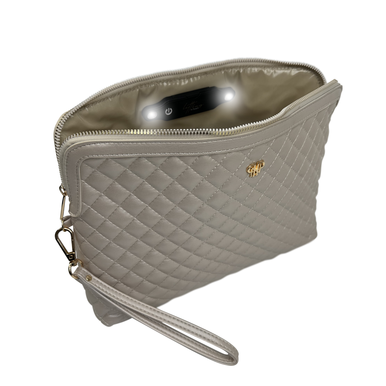 The Pearl LITT Makeup Case illuminates your beauty rituals with the amazing built-in LED Light. Ensure you never fumble in the dark looking for your essentials again. This isn’t just a makeup case. With the detachable wristlet this case doubles as a chic clutch. Seamlessly transition from day to night, effortlessly carrying your keys, lipstick, and more. The design includes a middle divider with a zipper closure that keeps your items securely in place, while the four interior pockets provide a dedicated space for your smaller essentials.