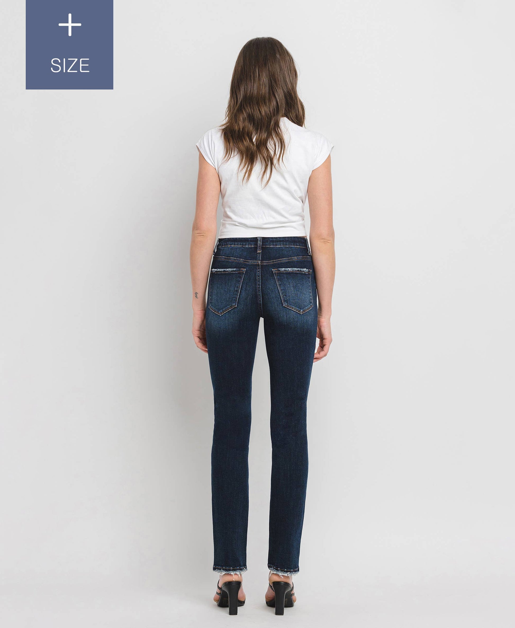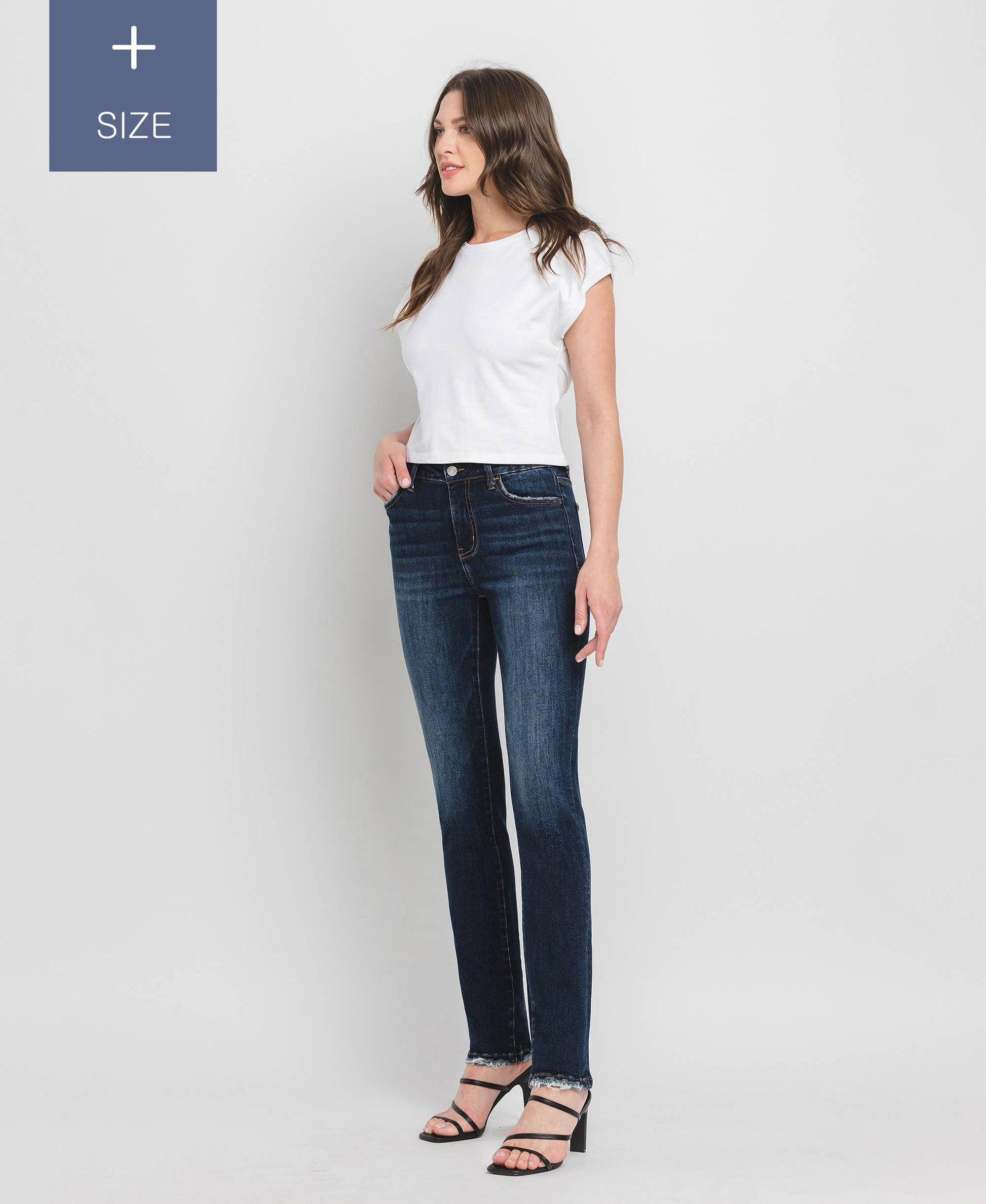PLUS SIZE TUMMY CONTROL HIGH RISE SLIM STRAIGHT JEANS COMFORT STRETCH DENIM, HIGH RISE WAIST, FULL LENGTH, SLIM STRAIGHT JEANS F. RISE: 12" / INSEAM: 32" / LEG OPENING: 16 1/2"