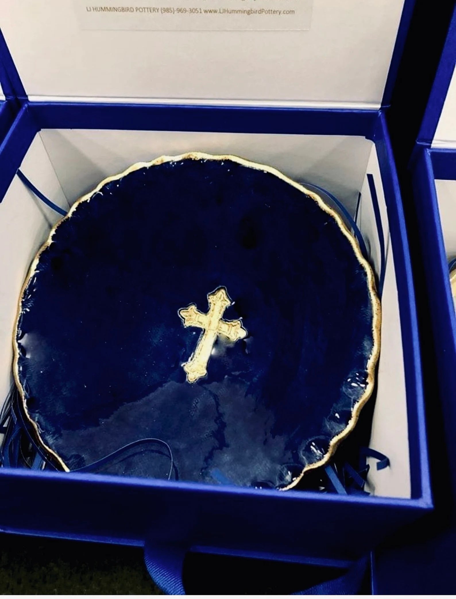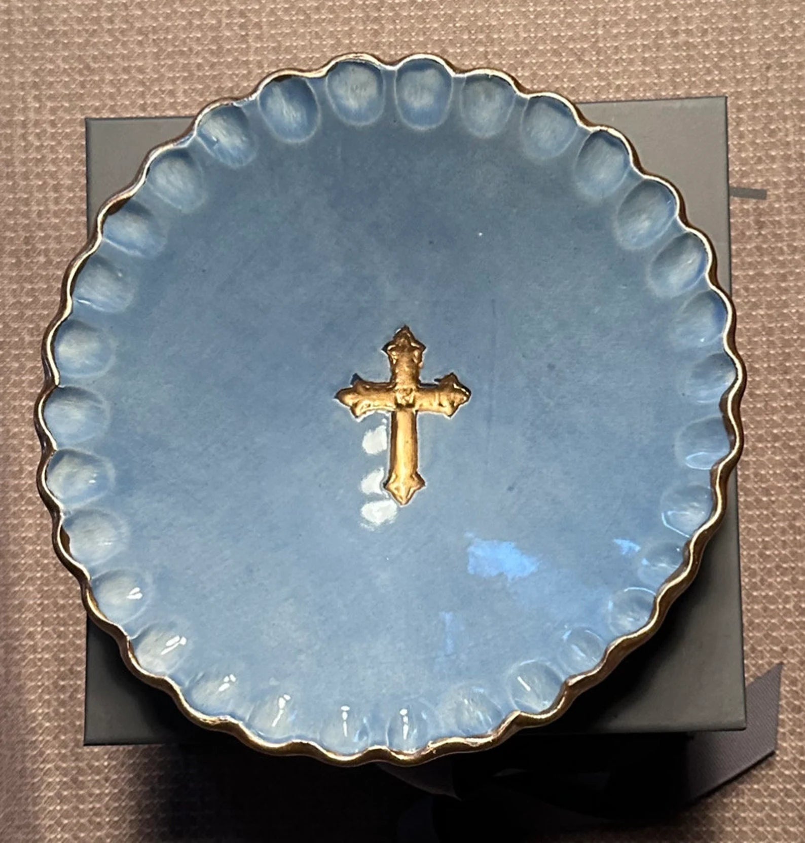 Gold cross in the middle of bowl.