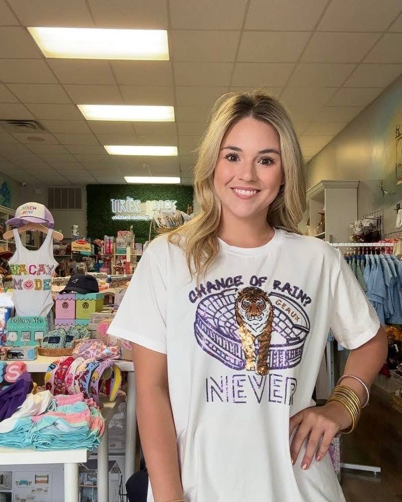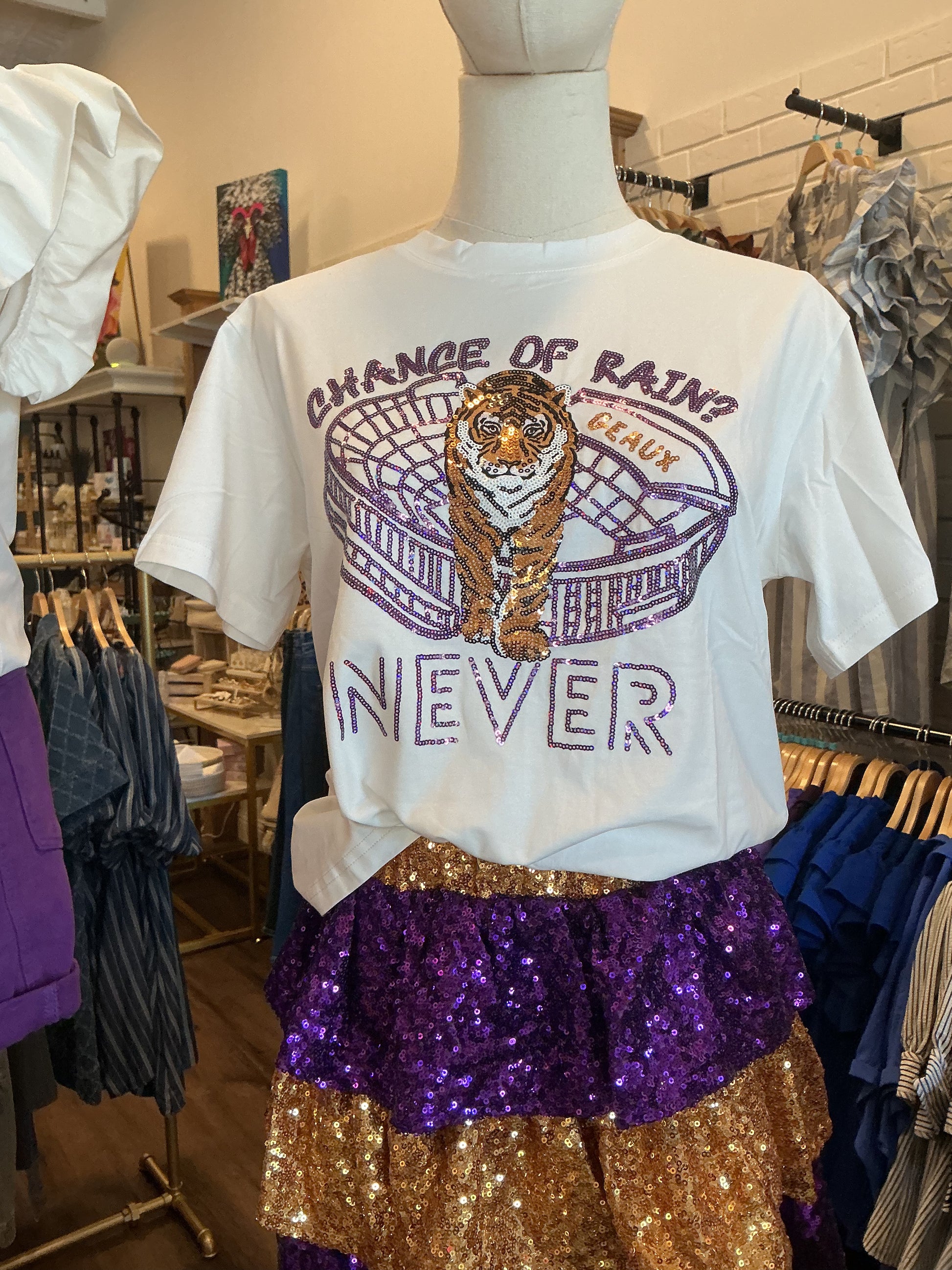 Bring the heat and shine bright on game day with our Purple and Gold Sequin Tee – a bold tribute to southern pride and football tradition! Featuring a sparkling sequin design, iconic Tiger Stadium graphic, and the fan-favorite phrase “Chance of Rain: Never,” this tee is made for tailgates, touchdowns, and standing strong in any weather (well... almost). Made from soft, breathable fabric with a flattering fit, it’s the perfect mix of glam and grit. Whether you're cheering in the stadium or hosting the pregame party, this shirt says you're loyal to the purple, the gold, and the game — rain or shine!