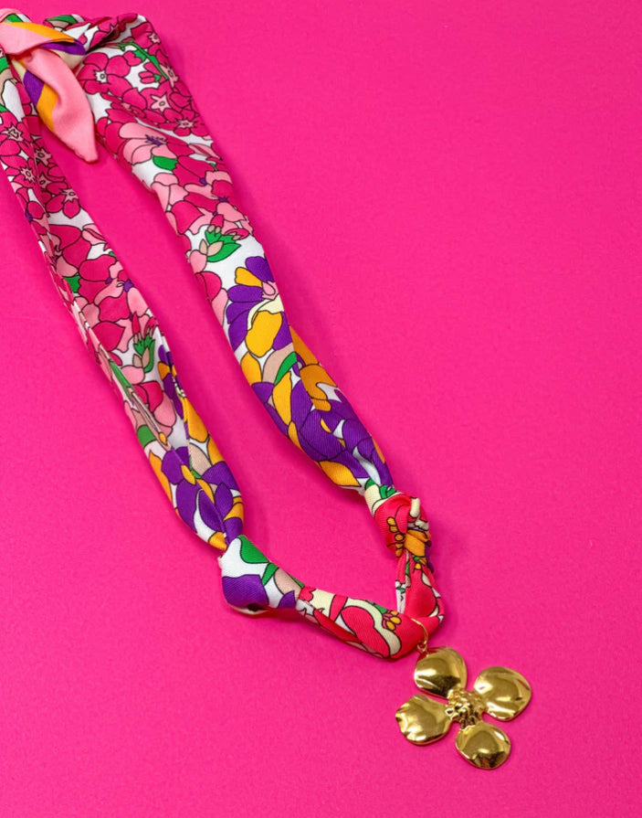 SCARF CHARM NECKLACE – PINK AND PURPLE FLORAL PRINT WITH GOLD FLOWER PENDANT