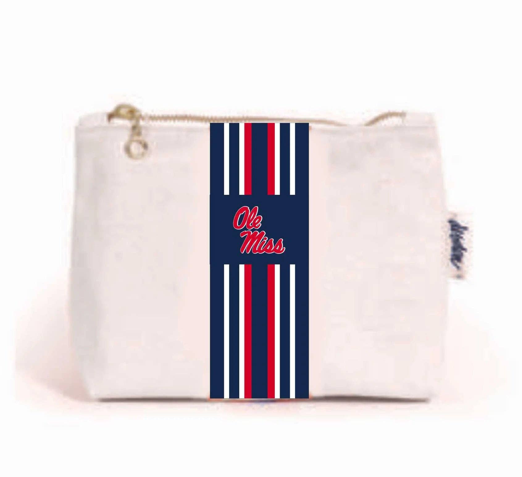 New! This handy pouch is the perfect way to store your everyday essentials. Crafted in the USA of heavy cotton canvas, features brass zipper closure and is officially collegiate licensed in full color striped print pattern. Use it to keep all the things organized in your bag, or carry it as an adorable clutch! * USA Made * Size: 8"w x 6"h x 3"d