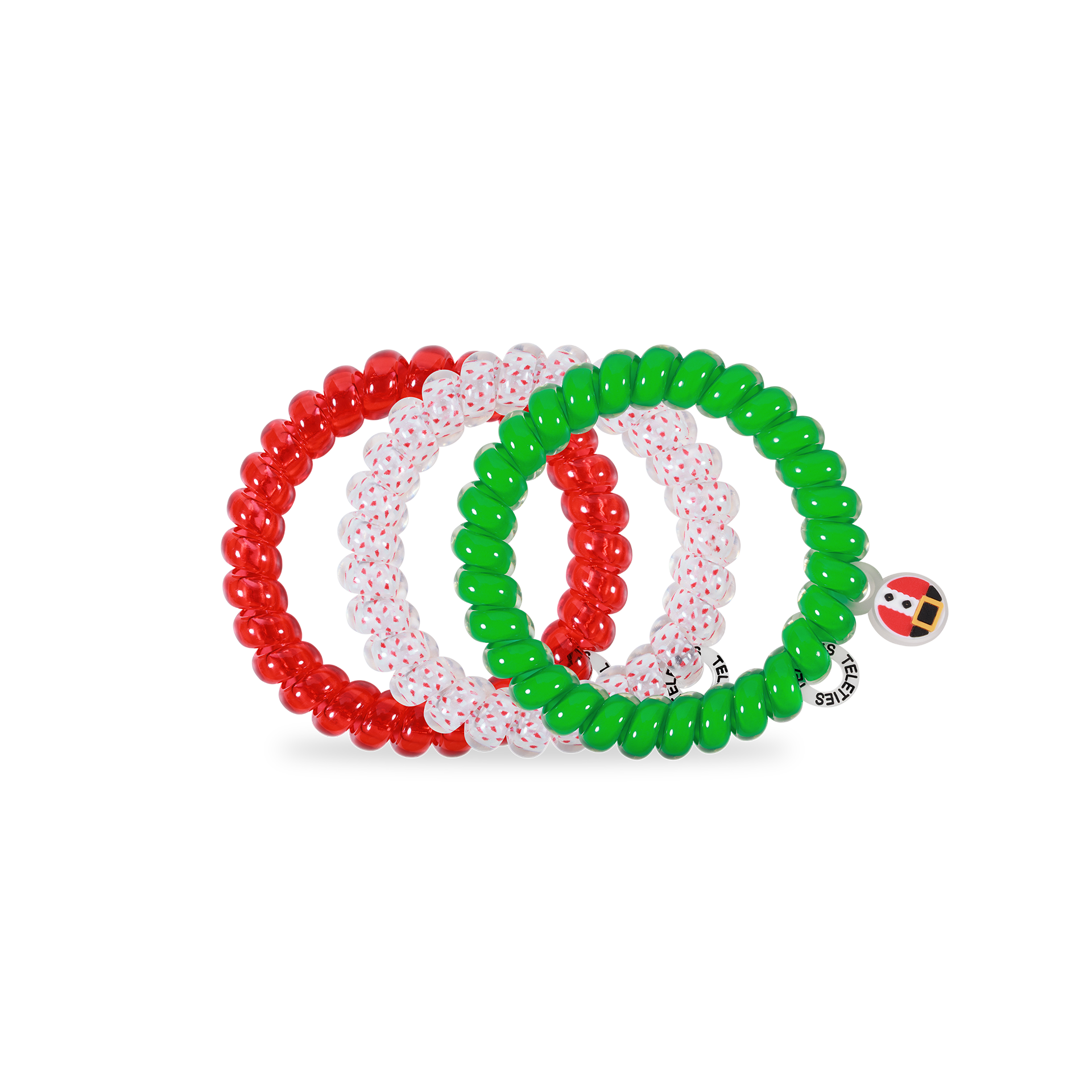 Secret Santa Large Hair Ties in Red, Green, and Clear offer a strong grip without damage, doubling as a chic wrist accessory when not in use. Your new favorite hair essentials all year round.