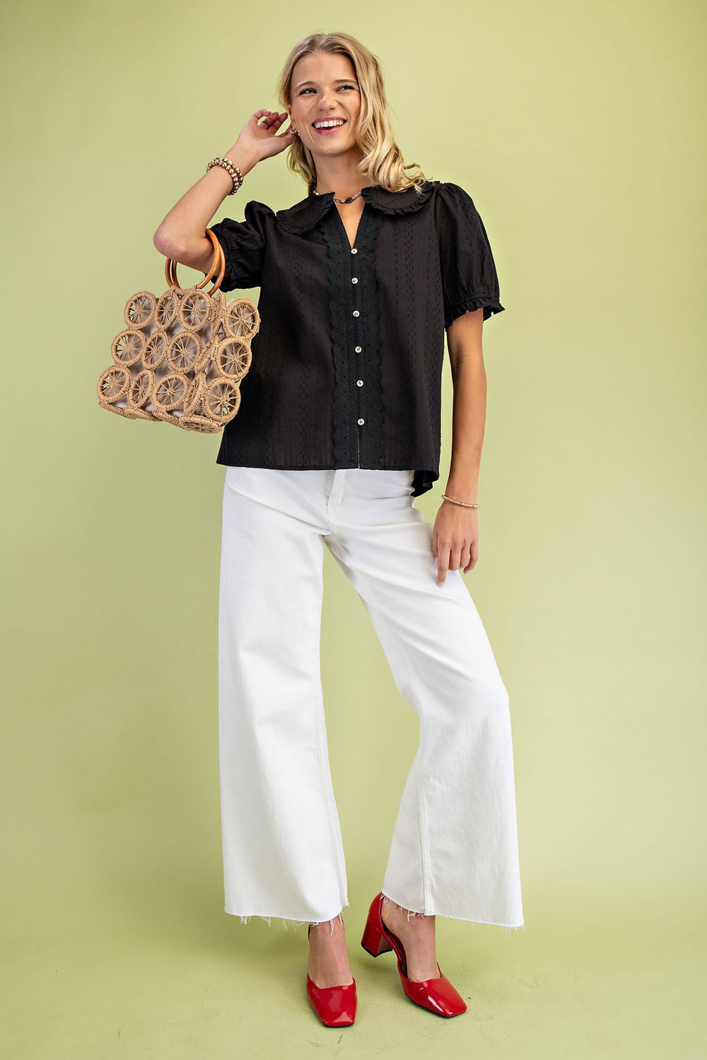This adorable button-down features a charming Peter Pan collar & short sleeves that bring the perfect touch of vintage sweetness. The silhouette is soft and feminine, with delicate buttons that trail down the front for a classic finish.