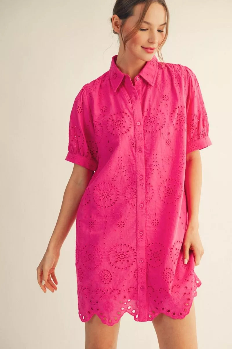 This hot pink eyelet mini dress is a flirty fit with an ultra-feminine feel. Lightweight, breathable, and perfect for summer days or nights out. The Pinkie Promise Mini is cute, confident, and full of charm.