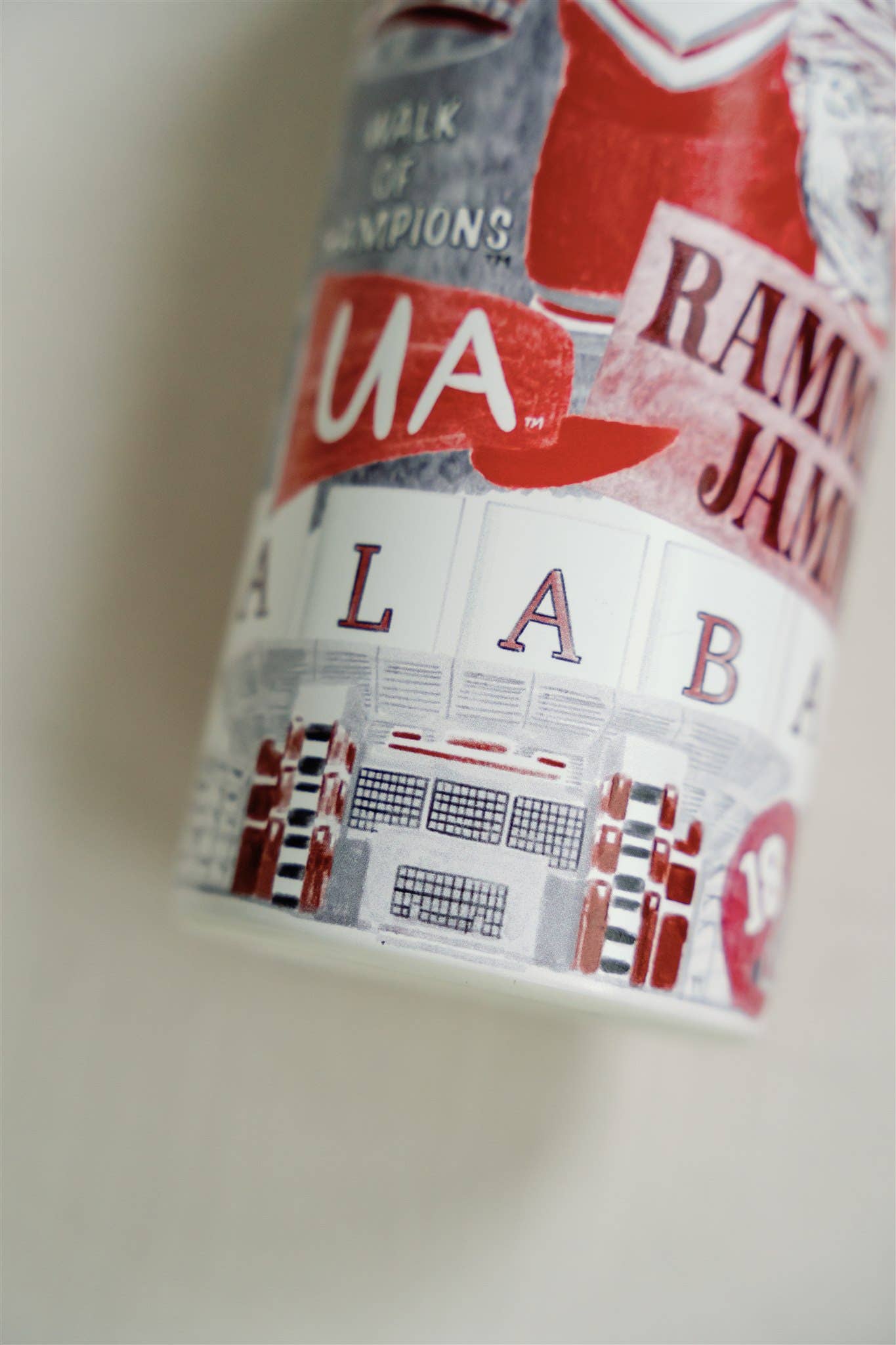 Insulated bottle featuring original illustrations of Alabama's Bryant-Denny Stadium, Rammer Jammer, Roll Tide, the President's Mansion, and more!