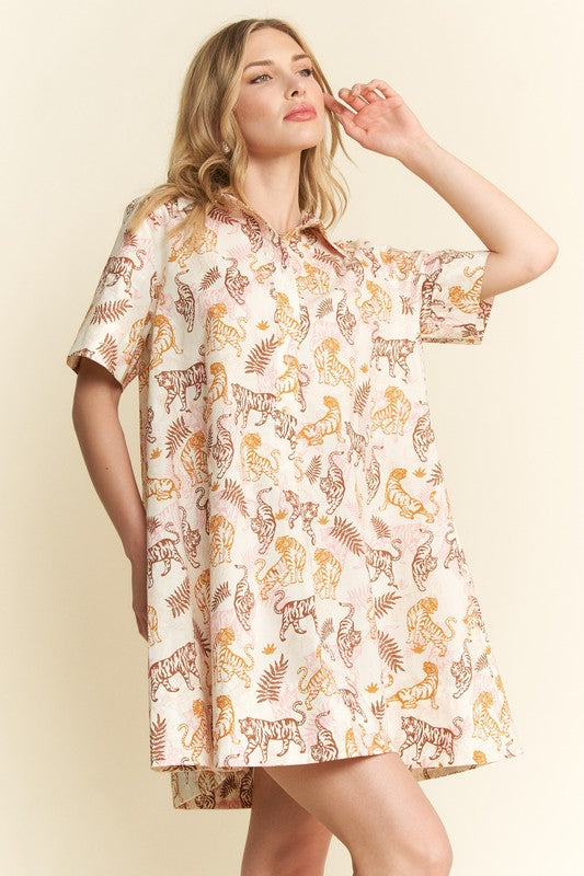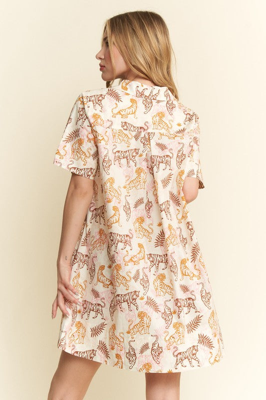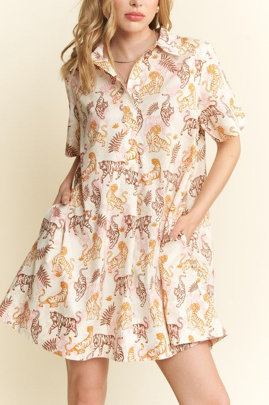 This playful collared mini dress features a bold tiger print and hits mid-thigh for a flirty look. It has a partial button-down front with a classic polo-style collar and a breezy, flared skirt. Made from 100% cotton, it includes handy pockets for added fun and function. Perfect for adding a wild touch to your Game Day wardrobe!