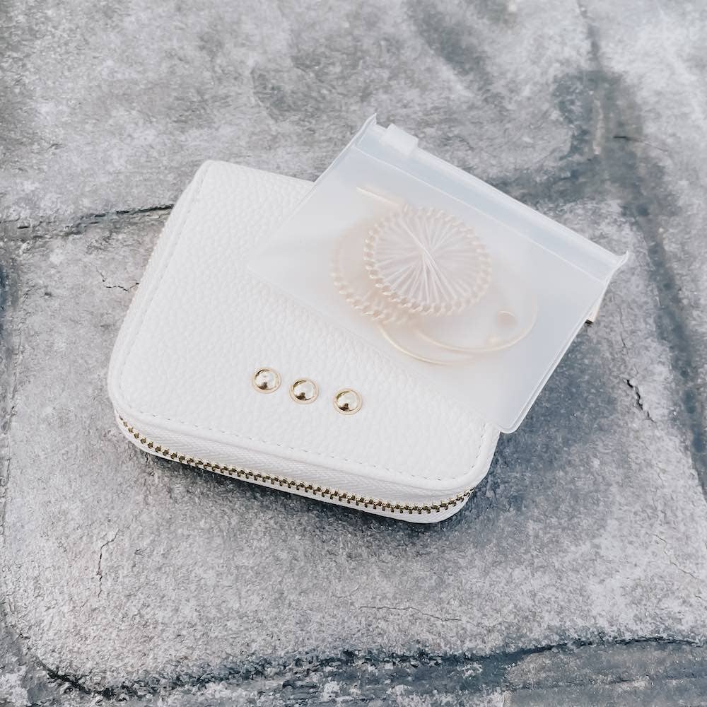 Welcome to your travel organizer for jewelry, pills, supplements and more. Our Wanderer Pouch is the smaller version of our Journey Box and holds 7 reusable slide lock pouches that can store your medications, earrings, necklaces, supplements and other small items during travel. Compact, beautiful, brilliant.
