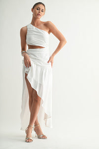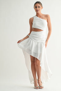 Make a bold entrance with this one-shoulder maxi dress featuring ruched detailing, a flattering waist cut-out, and a dramatic high-low hem. The sculpted bodice enhances your shape while the side zipper keeps the silhouette clean and easy to wear. Style it with heels for a night out or dress it down with sandals for a sleek day-to-night transition. Available in